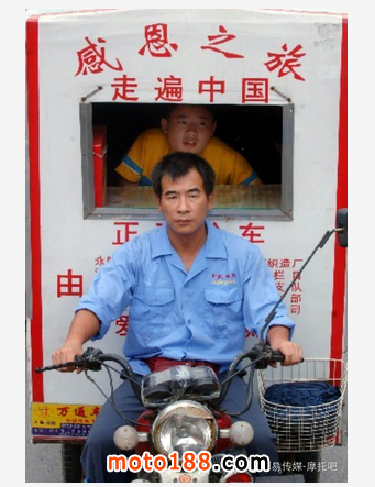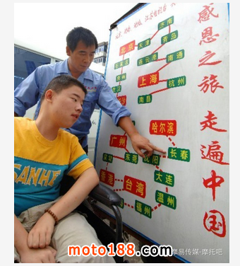 感恩的旅途并不輕松。三輪摩托載著輪椅,每天只能行駛100多公里。鐵皮包的車廂,雨天冷,晴天熱,火辣辣的太陽一曬,車廂內(nèi)變成了“桑拿房”。黃舸在車廂里的輪椅上顛簸,每行駛一兩個小時,就不得不讓父親背下車來透透風,活動一下身體。父親心疼兒子,為了讓孩子看到更多風景,把三輪摩托駕駛座前面、上面的玻璃和擋雨布都拆了,騎車雨天一身濕,晴天一身汗。說起父親,黃舸也幾次哽咽:因為自己“最后”的執(zhí)拗,虧欠父親很多。父親還反過來鼓勵我,說知恩圖報是好事,我們都是男子漢,應(yīng)該執(zhí)著。