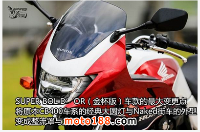 核心提示: CB400 SB版即CB400 SUPER BOL D'OR 在國內很多摩友也叫他CB400金杯版, 至于為何叫金杯版,主要是為了紀念法國著名耐力摩