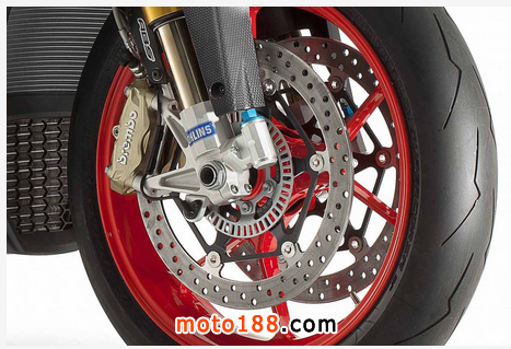 V4 1100 RR 與Factory 在制動上則盡乎相同,同樣使用BREMBO M432 輻射對四搭配320mm 大碟,不過Factory 的浮動扣采鋁合金材質。