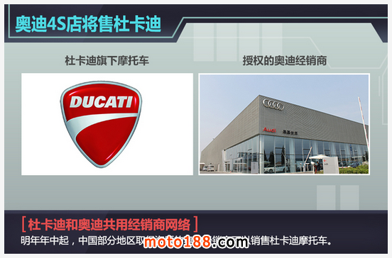 2015年我國汽車行業(yè)步入了低谷,各家車企的年銷目標(biāo)都面臨達(dá)不到的尷尬境遇,和汽車市場類似,受到汽車降價和部分城市禁摩的沖擊,2014年我國摩托車產(chǎn)銷量分別為2126.78萬輛和2129.44萬輛,同比也有所下降,不過摩托車市場潛力非常大。杜卡迪作為摩托車市場中的領(lǐng)導(dǎo)品牌,越來越注重中國市場的拓展和開發(fā),網(wǎng)通社在對杜卡迪全球CEO Claudio Domenicali先生對網(wǎng)通社表示,明年年中起,中國部分地區(qū)取得資質(zhì)的奧迪經(jīng)銷商可以銷售杜卡迪摩托車。此舉表明杜卡迪有意借奧迪完善的經(jīng)銷商體系來方面自己擴(kuò)大市場,在品牌建設(shè)方面發(fā)力。