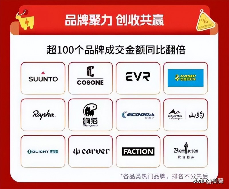 超過(guò)100個(gè)品牌成交額同比翻倍,其中騎行品牌最熱門的包括中高端國(guó)產(chǎn)騎行服品牌EVR,和高端騎行服品牌Rapha。整車國(guó)產(chǎn)品牌坎普自行車成交額在這個(gè)周期同比也直接翻倍。