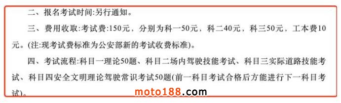 最近貴州滑石鄉(xiāng)就開展了摩托車駕駛證送考活動,有需要考取摩托車駕駛證的群眾,直接在村委會預(yù)約登記,考試費(fèi)用直接按照公安部最新的考試標(biāo)準(zhǔn)進(jìn)行收取。科目一50元、科目二40元、科目三50元、工本費(fèi)10元,一共是150元。