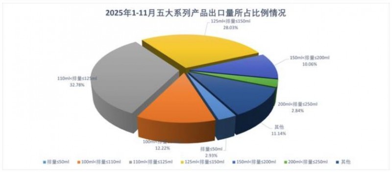 1-11月,跨騎車產銷1041.54萬輛和1038.91萬輛,同比增長15.36%和15.46%;踏板車產銷513.99萬和508.86萬輛,同比下降2.3%和4.36%;彎梁車產銷200.77萬輛和200.17萬輛,同比增長28.77%和30.46%。從各車型銷量占二輪車總銷量的比重看,跨騎、踏板和彎梁三類車型占比分別為59.43%、29.11%和11.45%。