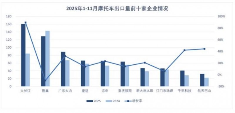 1-11月,摩托車出口量排名前十位的企業依次為:大長江、隆鑫、廣東大冶、廣州豪進、宗申、重慶銀翔、新大洲本田、江門市珠峰、重慶千里科技、航天巴山,上述十家企業共出739.82萬輛,占摩托車出口總量的61.23%。