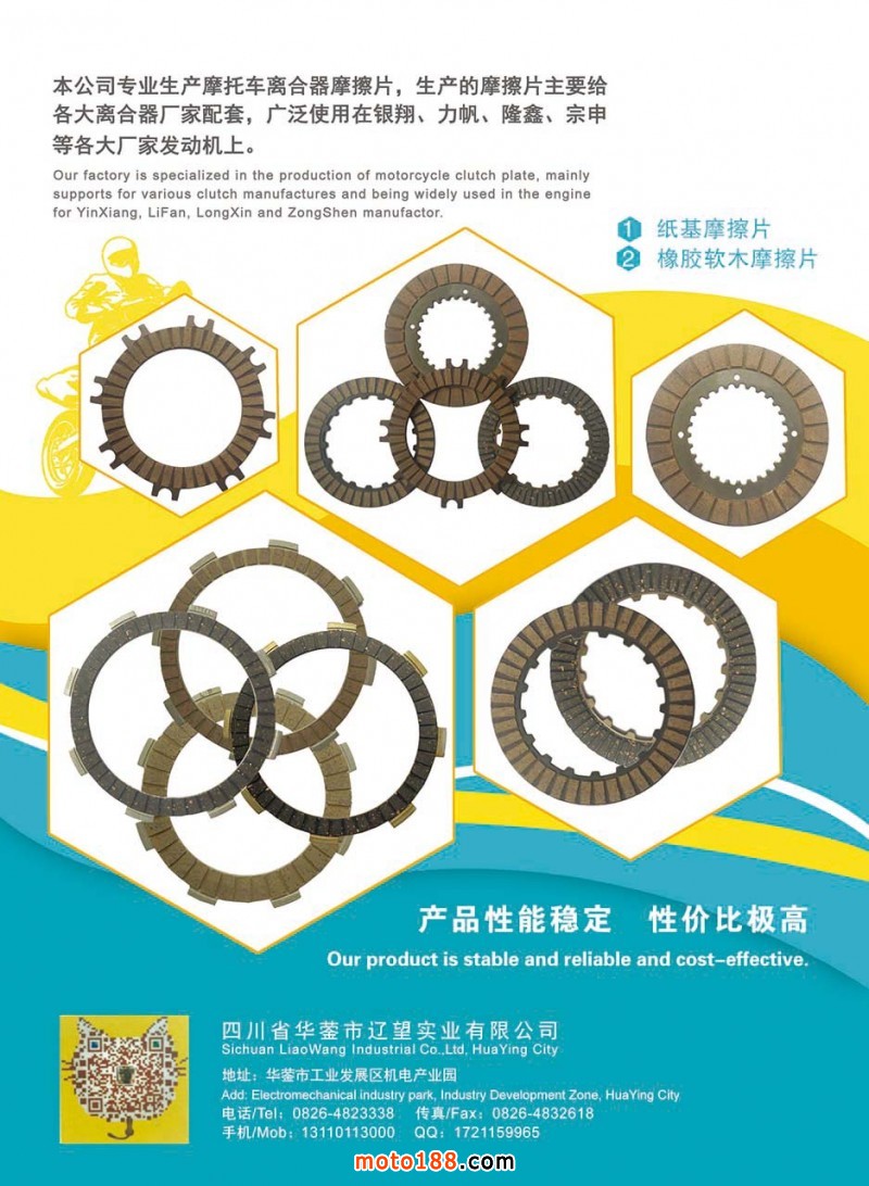 摩托車離合器摩擦片:紙基摩擦片、橡膠軟木摩擦片。生產的摩擦片主要給各大離合器廠家配套,廣泛使用在銀翔、力帆、隆鑫、宗申等各大廠家發動機上。