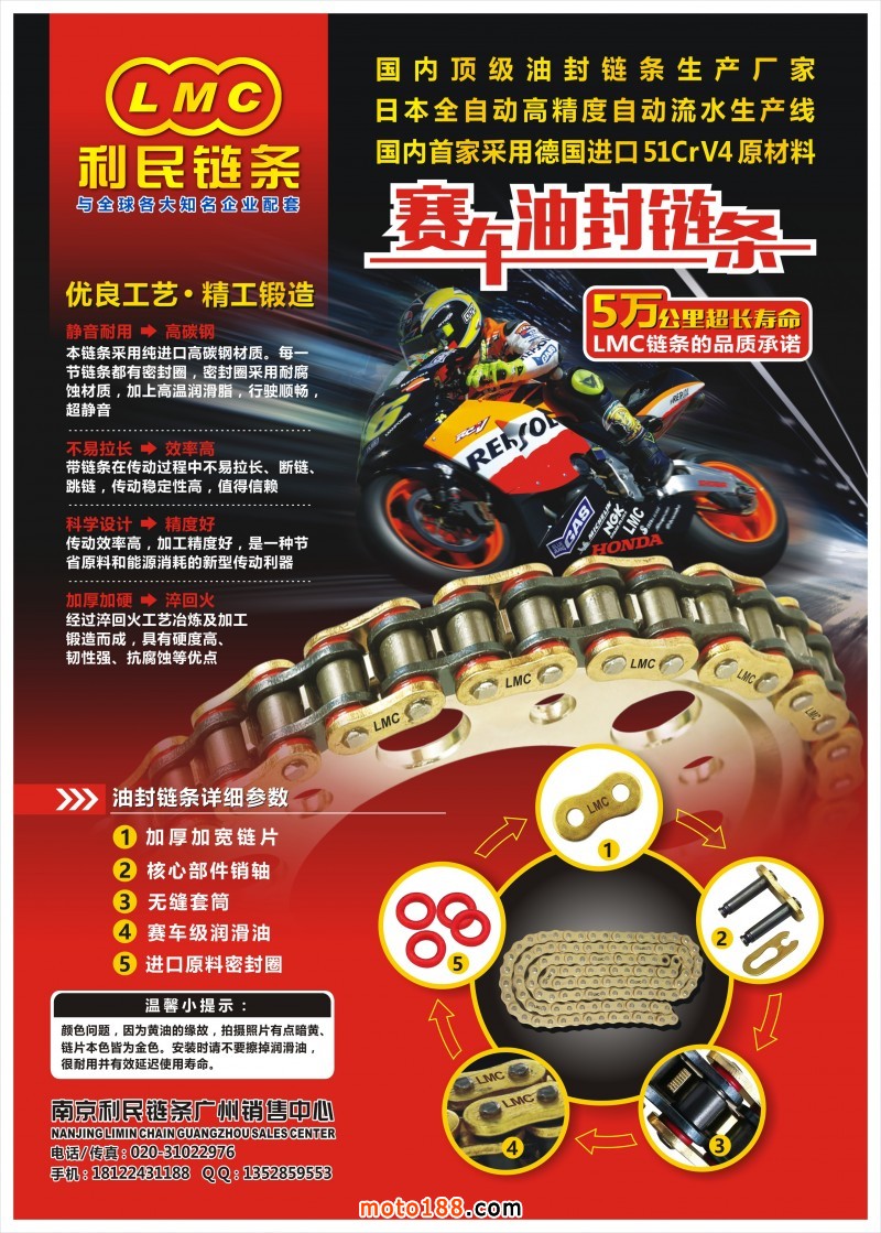 你想要的,都在LMC-南京利民鏈條。豪爵、鈴木、本田等一線品牌主要配套;本田系列二十年合作的認可;國內首家采用德國進口51CrV4原材料,一個認真耕耘了四十年的民族品牌!!!南京利民鏈條,擁有,就會得到更多......