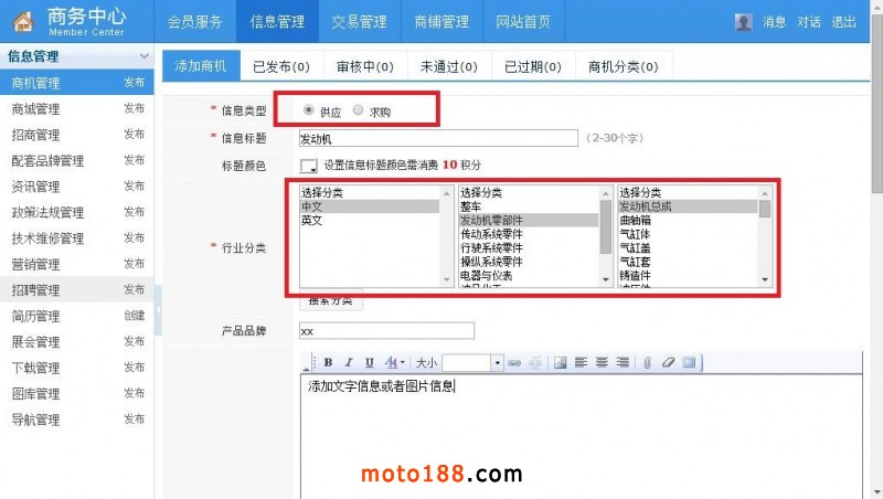 12.發(fā)布信息時(shí),請(qǐng)選擇供應(yīng)或是求購,選擇好分類,同時(shí)填好其他需要顯示的相關(guān)信息